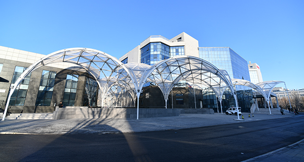 拉斐尔云廊为铝合金单层自由曲面网壳,总长度约1.5公里,宽度为118m,高度为100米,屋盖采用树杈柱支撑在22栋高80m的主楼楼顶,楼间距130m。
